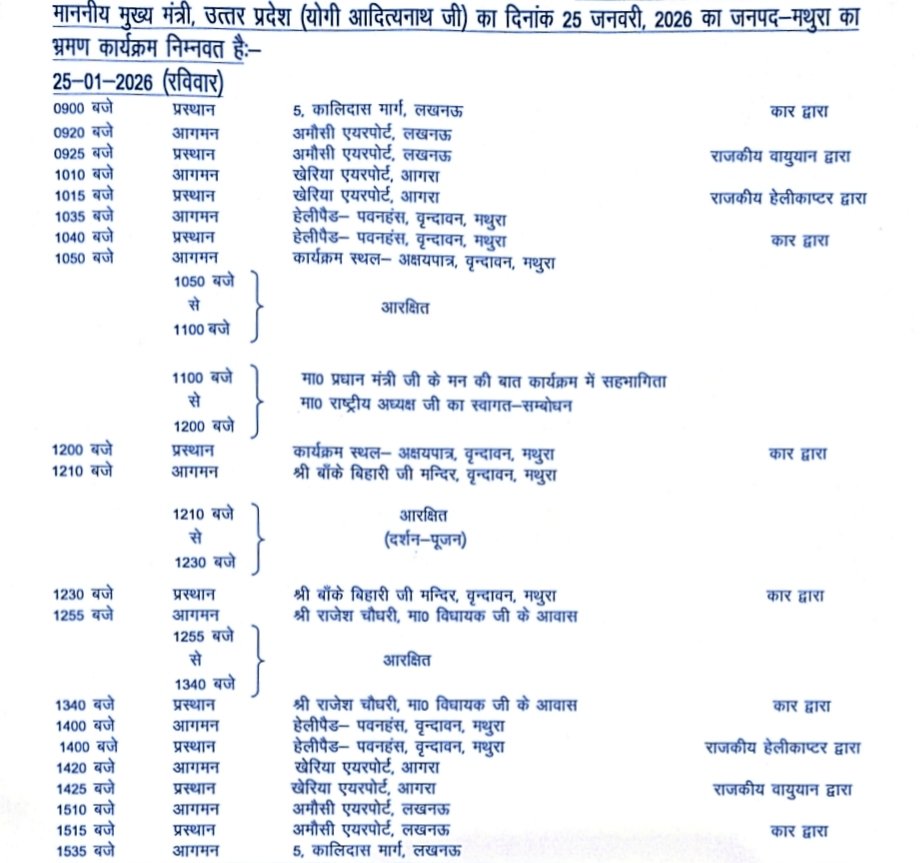 योगेश खत्री टीटीआई न्यूज़ मथुरा यूपी 25 जनवरी 2026 मुख्यमंत्री योगी आदित्यनाथ आज मथुरा वृंदावन के दौरे पर आ रहे हैं वे विभिन्न कार्यक्रमों में सम्मिलित होंगे और उनके साथ भाजपा के नवनीत राष्ट्रीय अध्यक्ष अमित ... Read More
