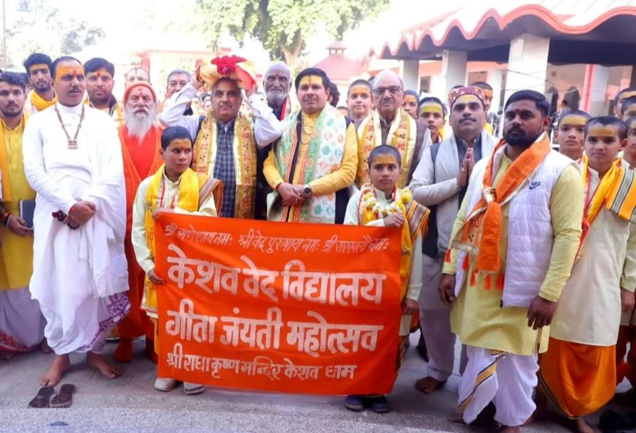 अंतराष्ट्रीय गीता जयंती पर वृन्दावन धाम में निकाली गई श्रीमद्भगवद्गीता जी की शोभायात्रा