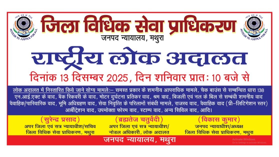 मथुरा। 11 दिसंबर 2025 जनपद न्यायाधीश/अध्यक्ष जिला विधिक सेवा प्राधिकरण, मथुरा श्री विकास कुमार द्वारा दिनांक 13.12.2025 (शनिवार) को आयोजित होने वाली राष्ट्रीय लोक अदालत की सफलता हेतु जनपद न्यायालय परिसर, मथुरा से दो प्र... Read More